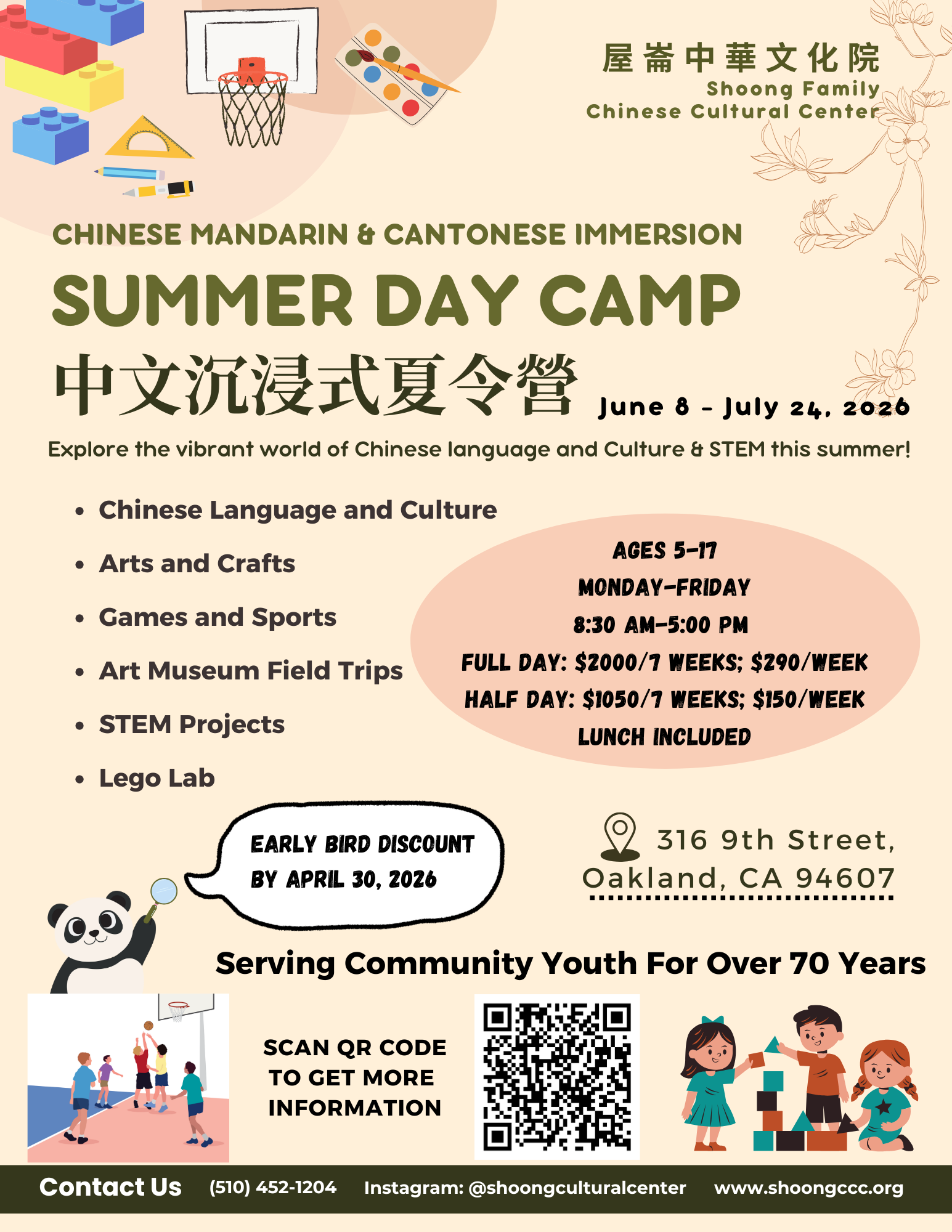 Explore the vibrant world of Chinese language and culture this summer! Join us from June 8 to July 24, 2026, at the Shoong Family Chinese Cultural Center, located at 316 9th Street, Oakland, CA.
